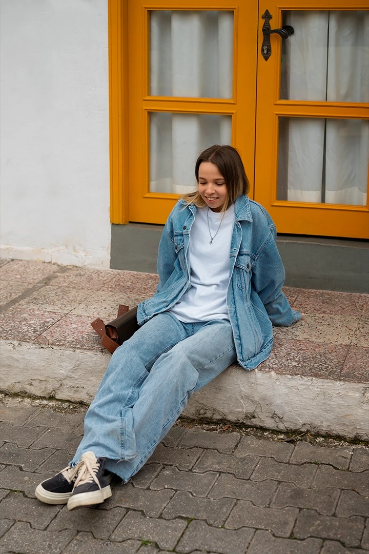 Yüksek bel, uzun baggy kadın kot şort. Rahat kalıbıyla modern, şık ve konforlu bir stil sunar.